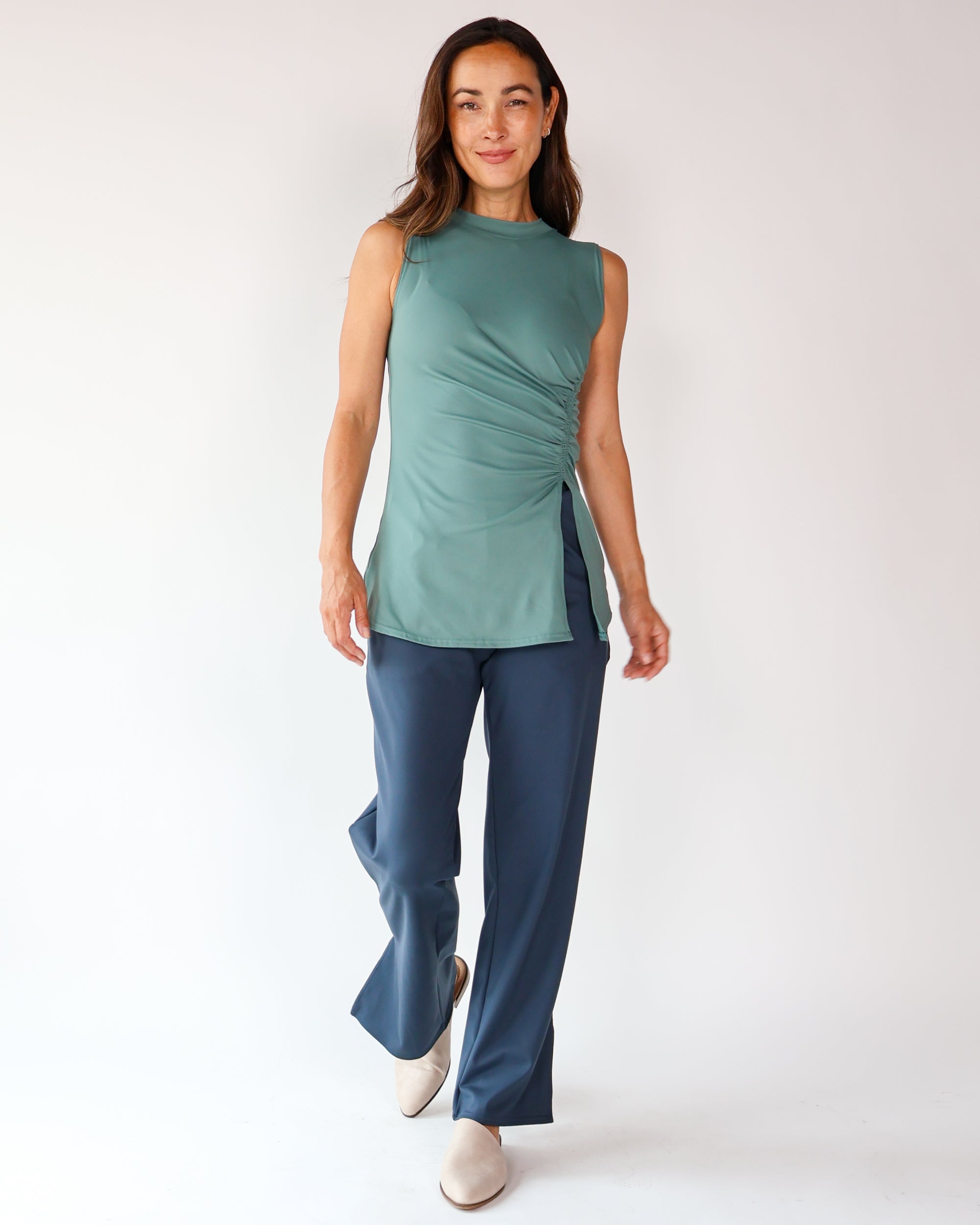 Step up your travel wardrobe with the Essential Wander Tank, featuring an asymmetrical ruched design that beautifully gathers at the waist for a flattering, contoured fit. With a stylish split on the left side, you’ll have easy access to pockets, while the extended hem offers full coverage. Its elegant crew neckline makes this tank a versatile layering piece, perfect for pairing with everything from joggers to skirts.