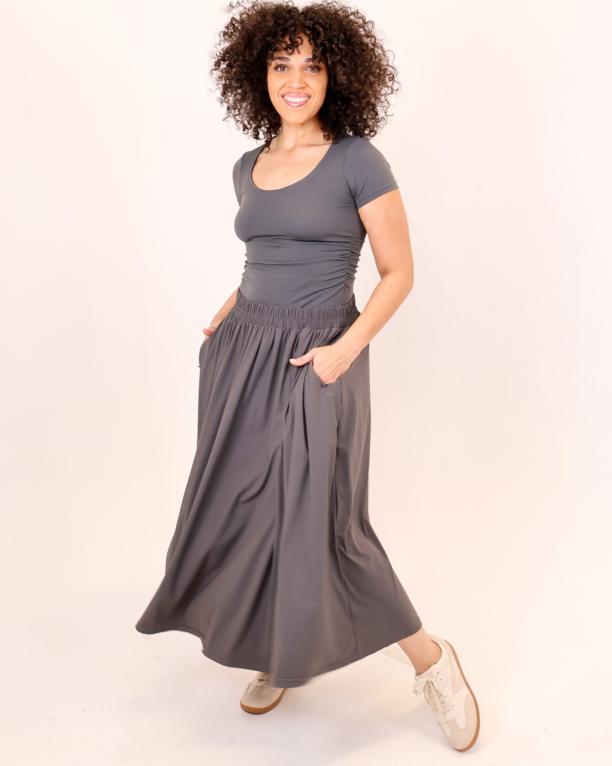 - Gathered A-line silhouette with a flattering ankle length