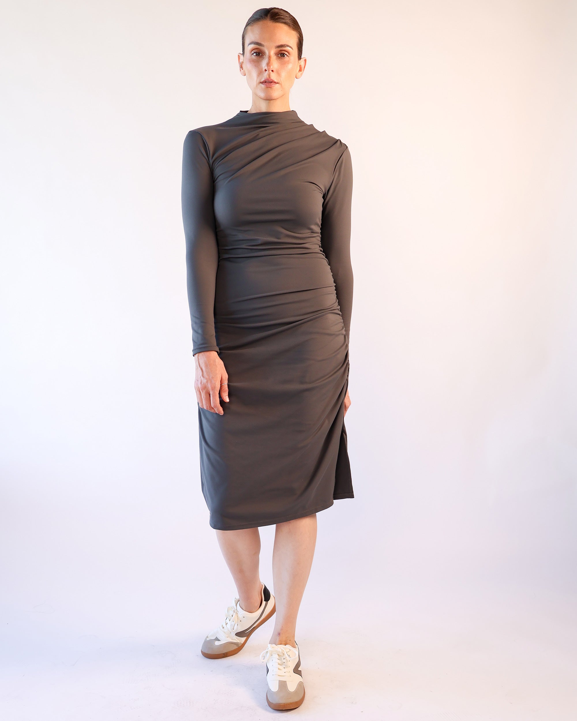Graceful. Comfortable. Uncomplicated. The Odyssey Cowl Dress was made for women on the go who need a gorgeous dress they can reach for any occasion. Its draped neckline and ruched side seams create a universally flattering fit, while the long, fitted sleeves add a refined touch. Lightweight and easy to pack, it’s the dress you’ll reach for again and again — from long flights to nights out abroad.