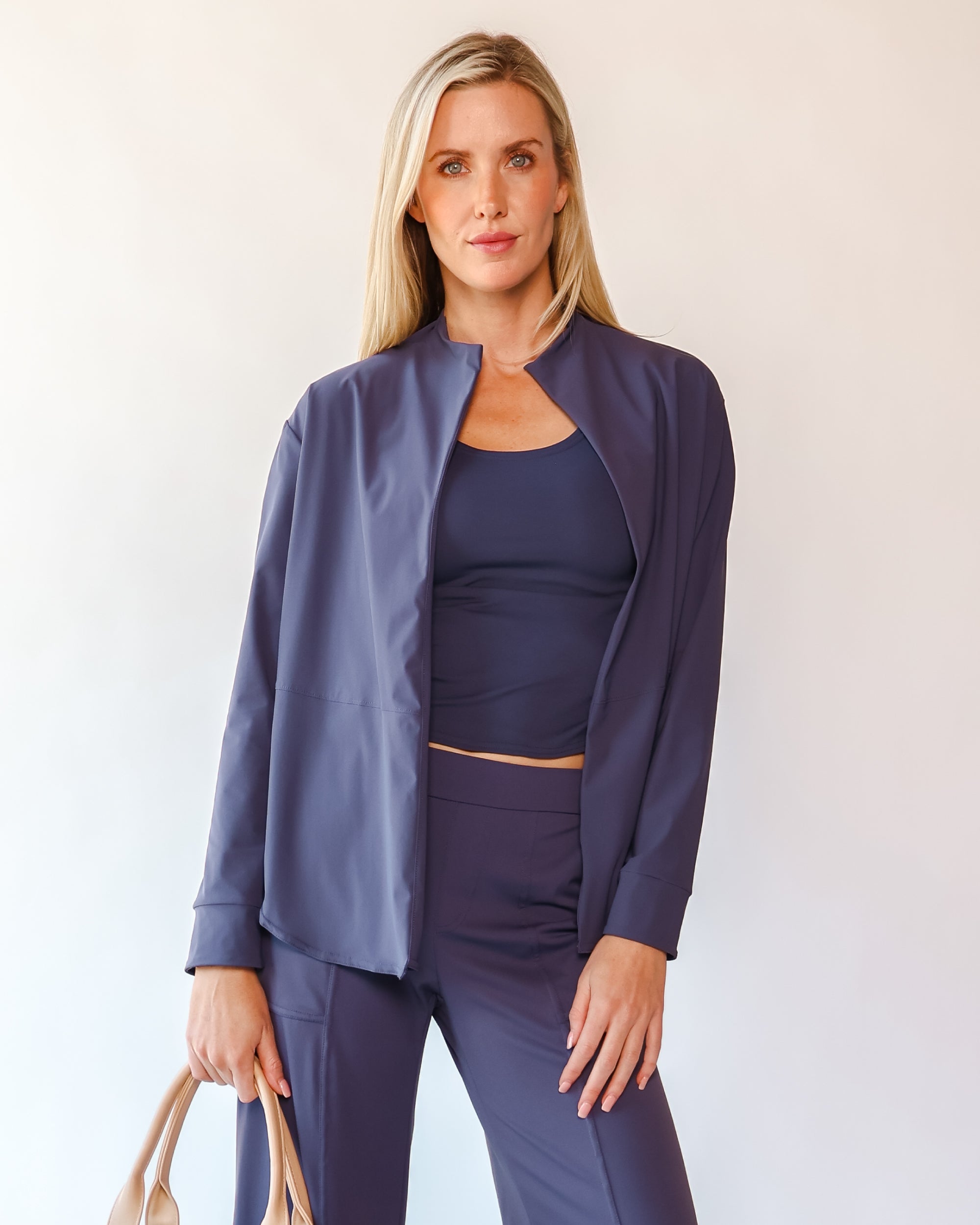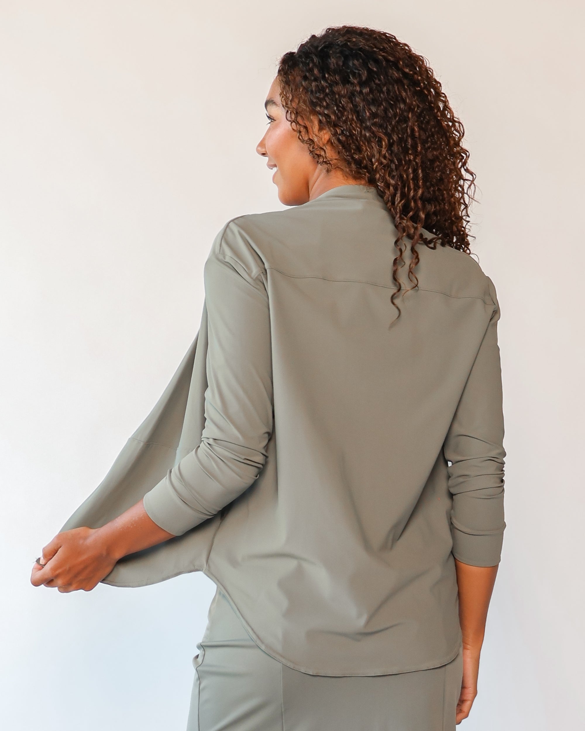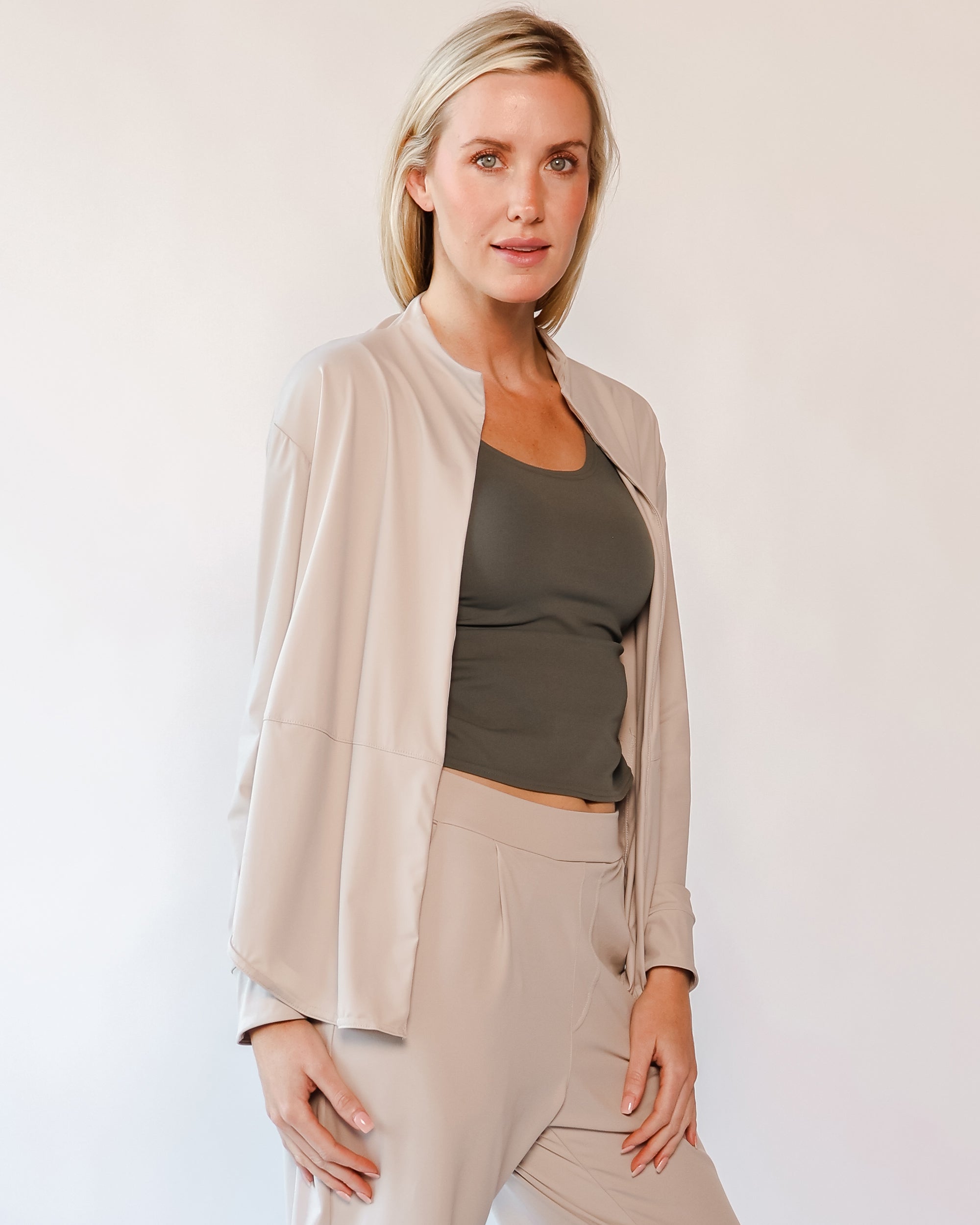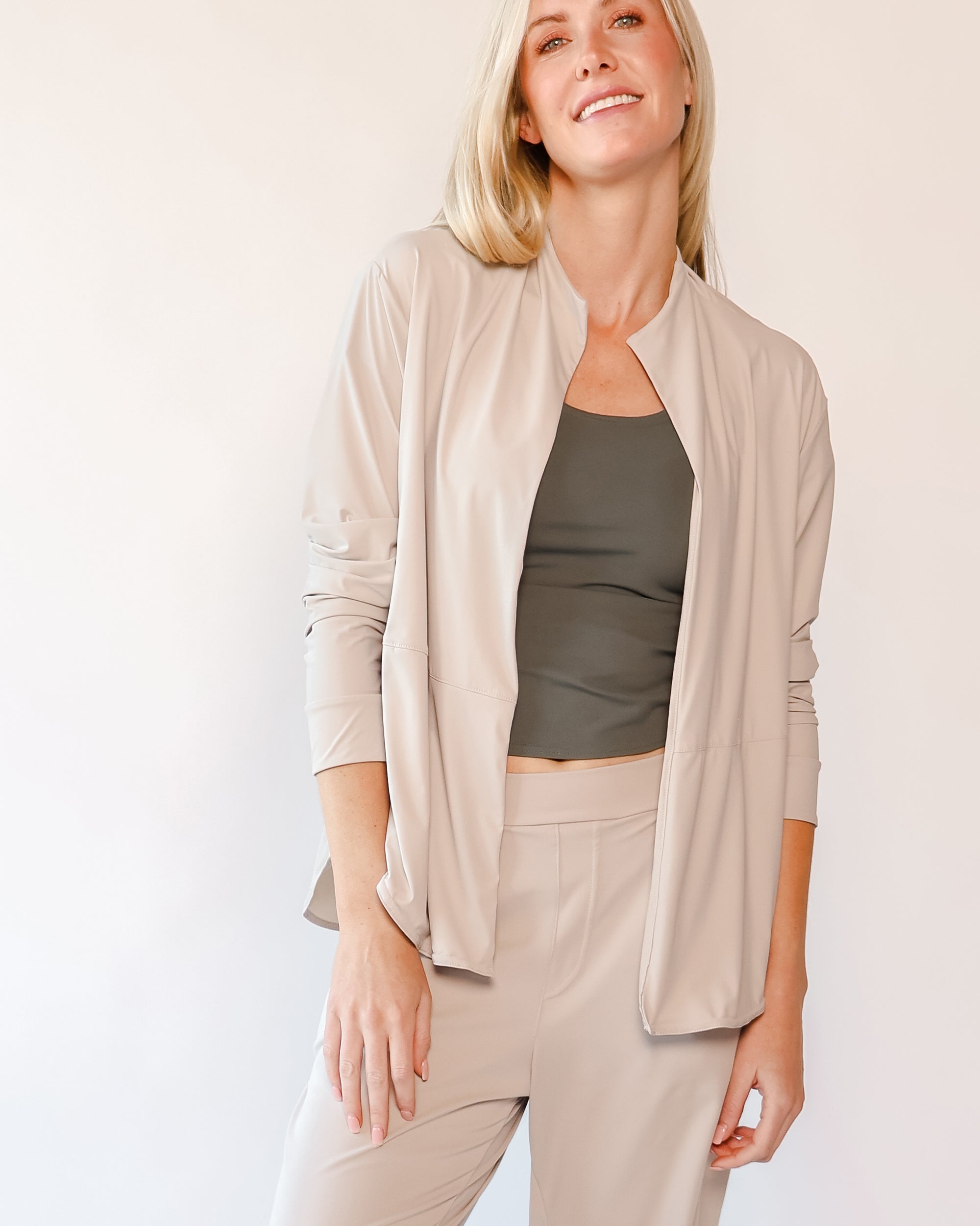 Our Lightweight Nomad Knit brings sophistication & ease to travel with its light, airy structure that drapes and moves with a graceful flow. While maintaining the structure you need, this fabric is perfect for layering and folding, making it easy to stow in a carry-on or backpack. Made from 75% recycled nylon from post-consumer water bottles and 25% elastane, it’s a conscious choice that doesn’t sacrifice comfort. The fabric’s ultra-fast drying powers, easy-clean surface, and anti-microbial properties keep it looking fresh on the go, and the faint horizontal stripe adds a hint of texture that complements any outfit.