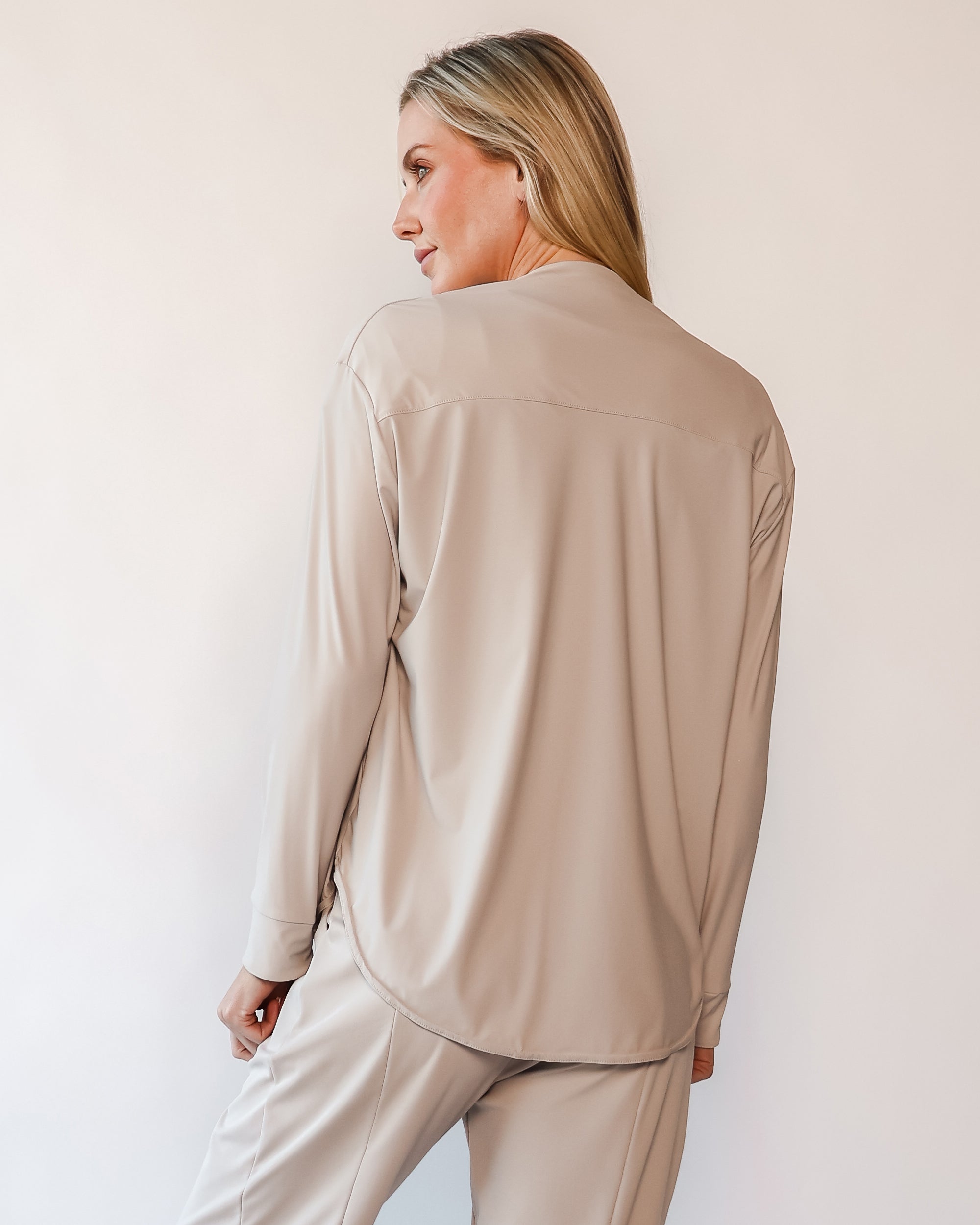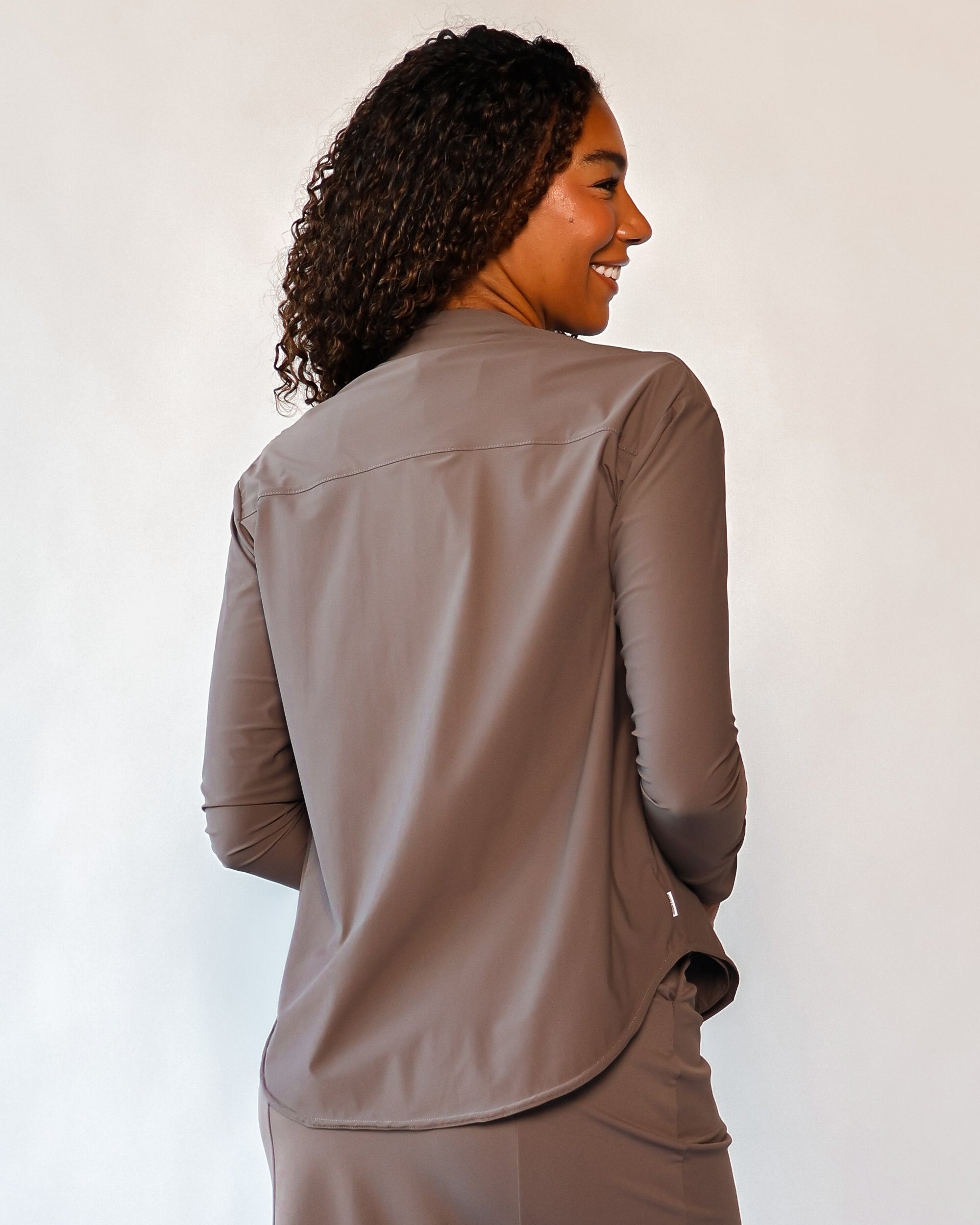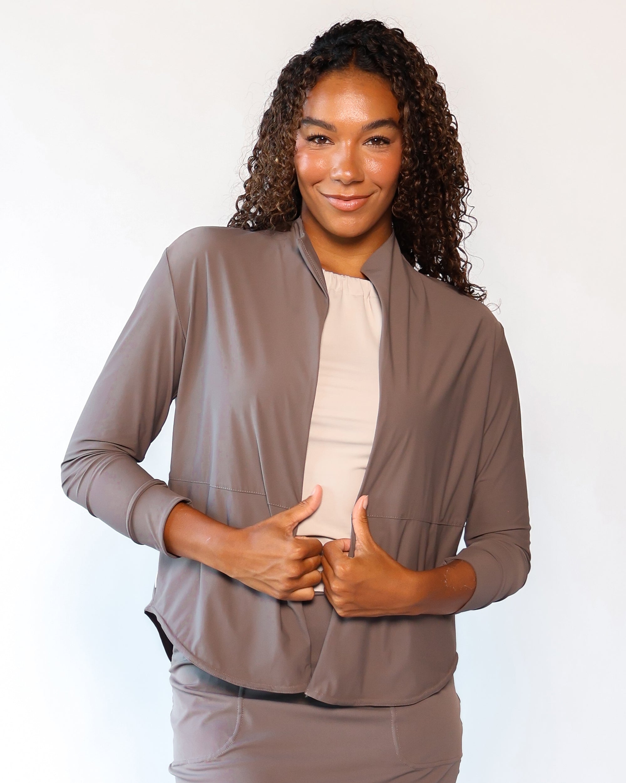 Our Lightweight Nomad Knit brings sophistication & ease to travel with its light, airy structure that drapes and moves with a graceful flow. While maintaining the structure you need, this fabric is perfect for layering and folding, making it easy to stow in a carry-on or backpack. Made from 75% recycled nylon from post-consumer water bottles and 25% elastane, it’s a conscious choice that doesn’t sacrifice comfort. The fabric’s ultra-fast drying powers, easy-clean surface, and anti-microbial properties keep it looking fresh on the go, and the faint horizontal stripe adds a hint of texture that complements any outfit.